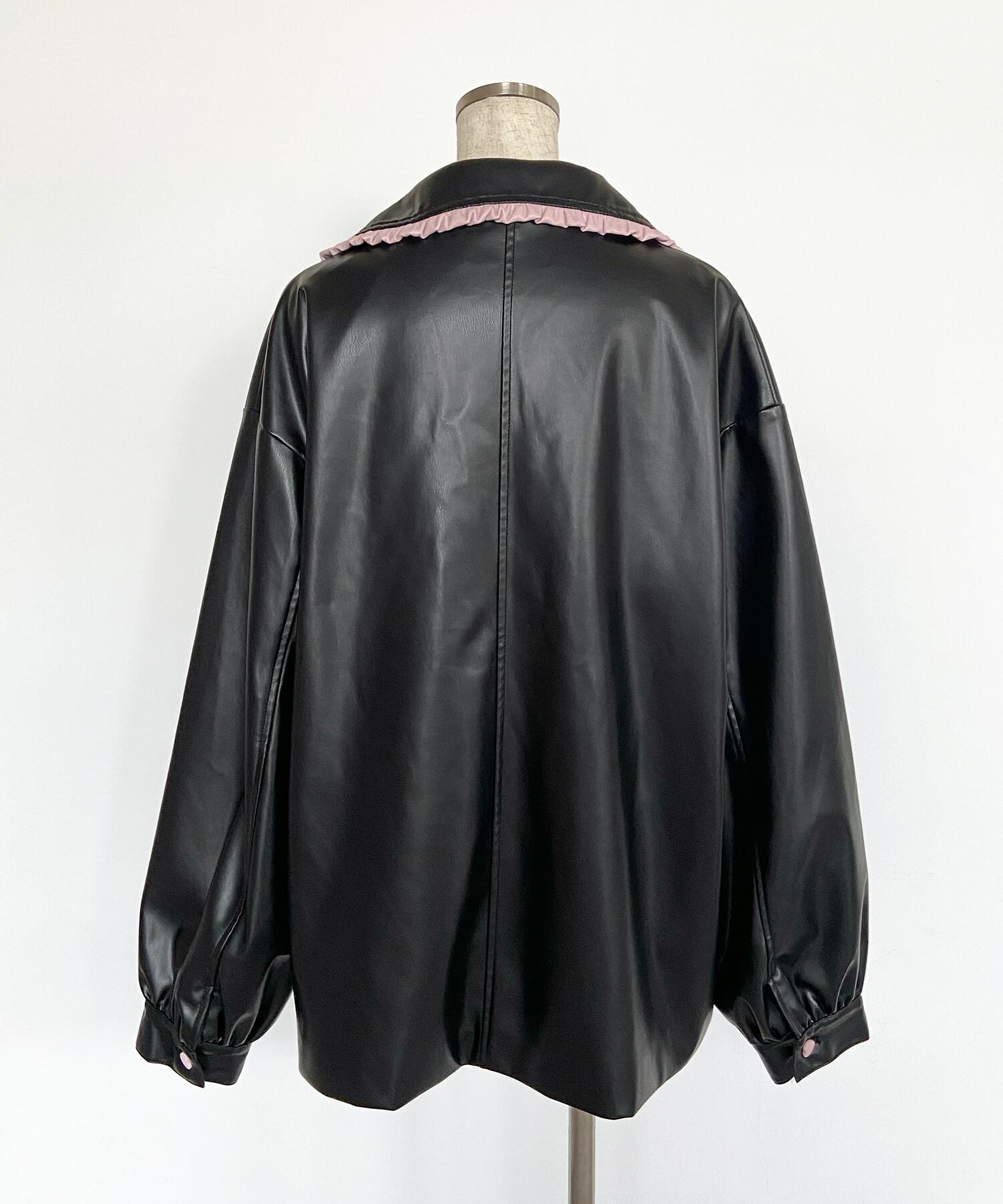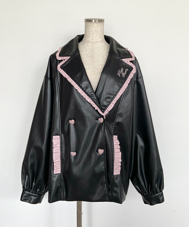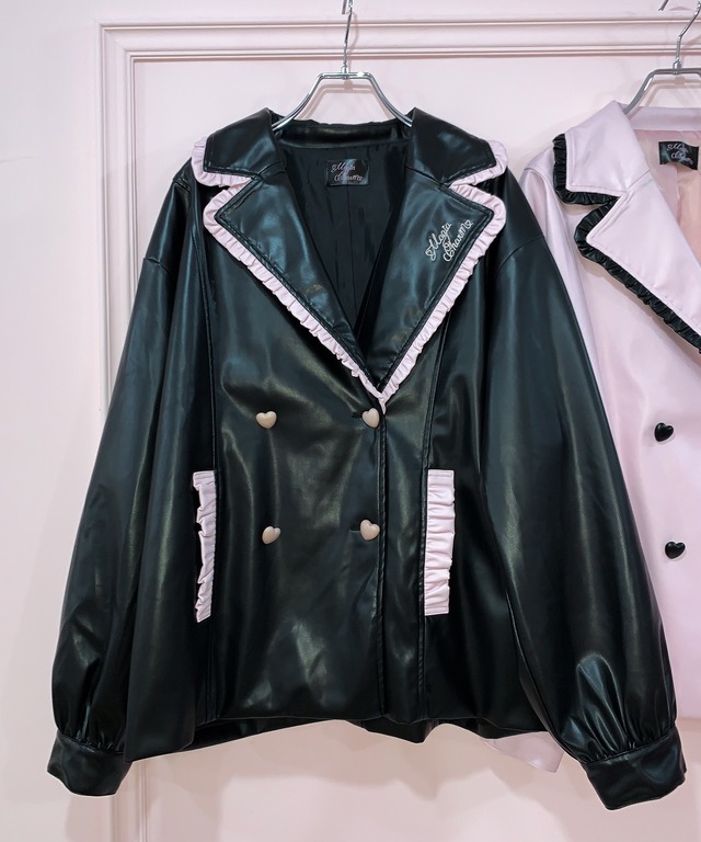 襟とポケットにあしらわれた配色フリルがクールなレザージャケットに甘さをプラス♡