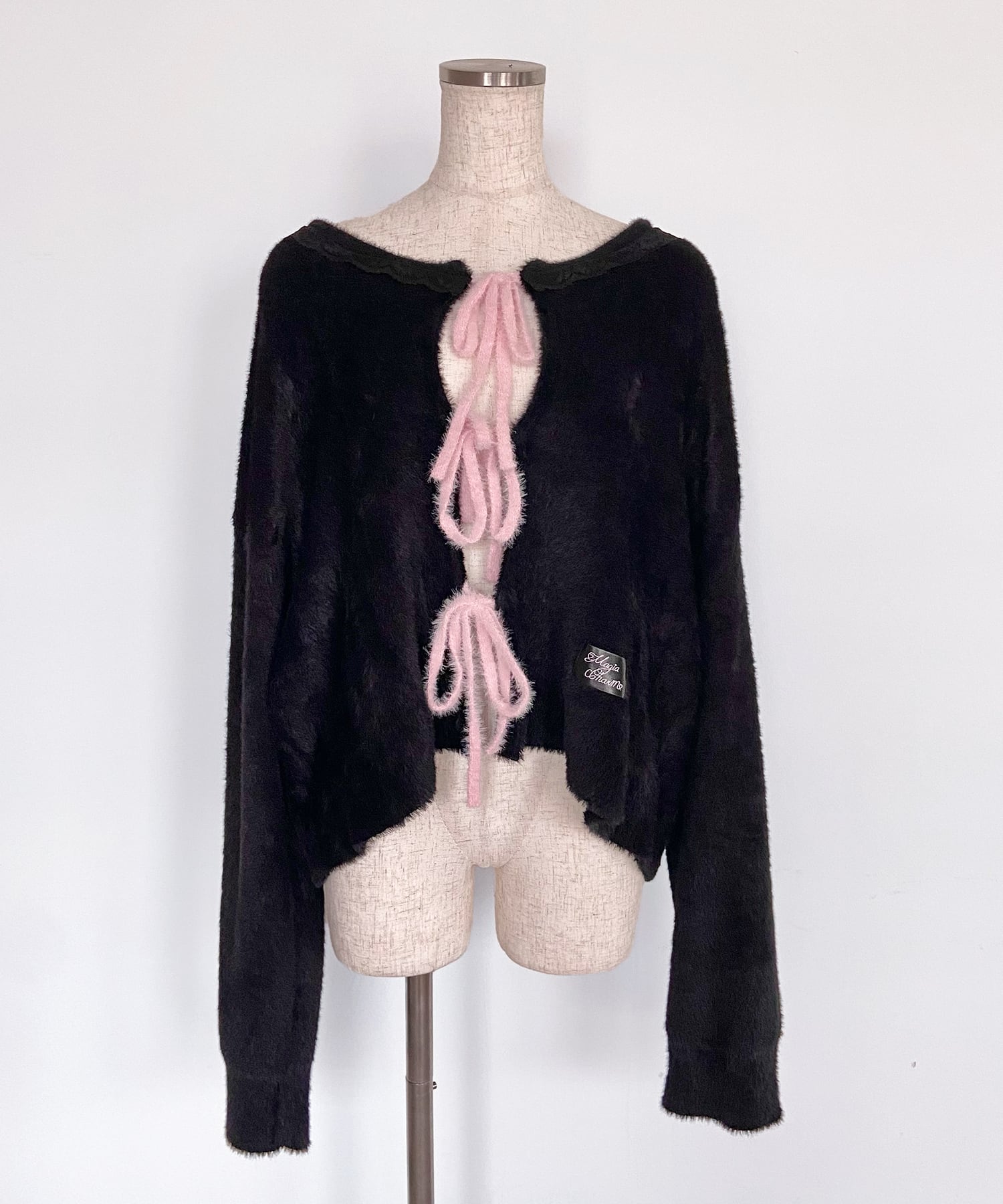もこもことした素材と、フロントのレースアップリボンが可愛らしいカーディガン!