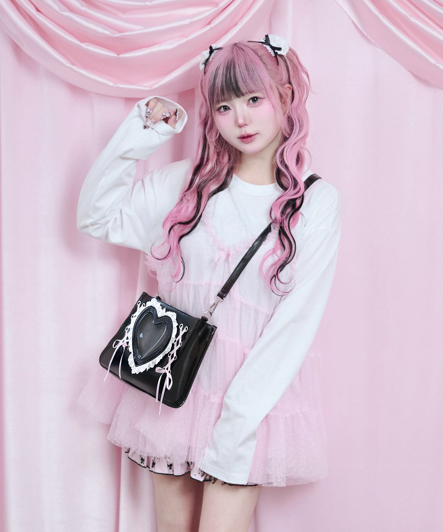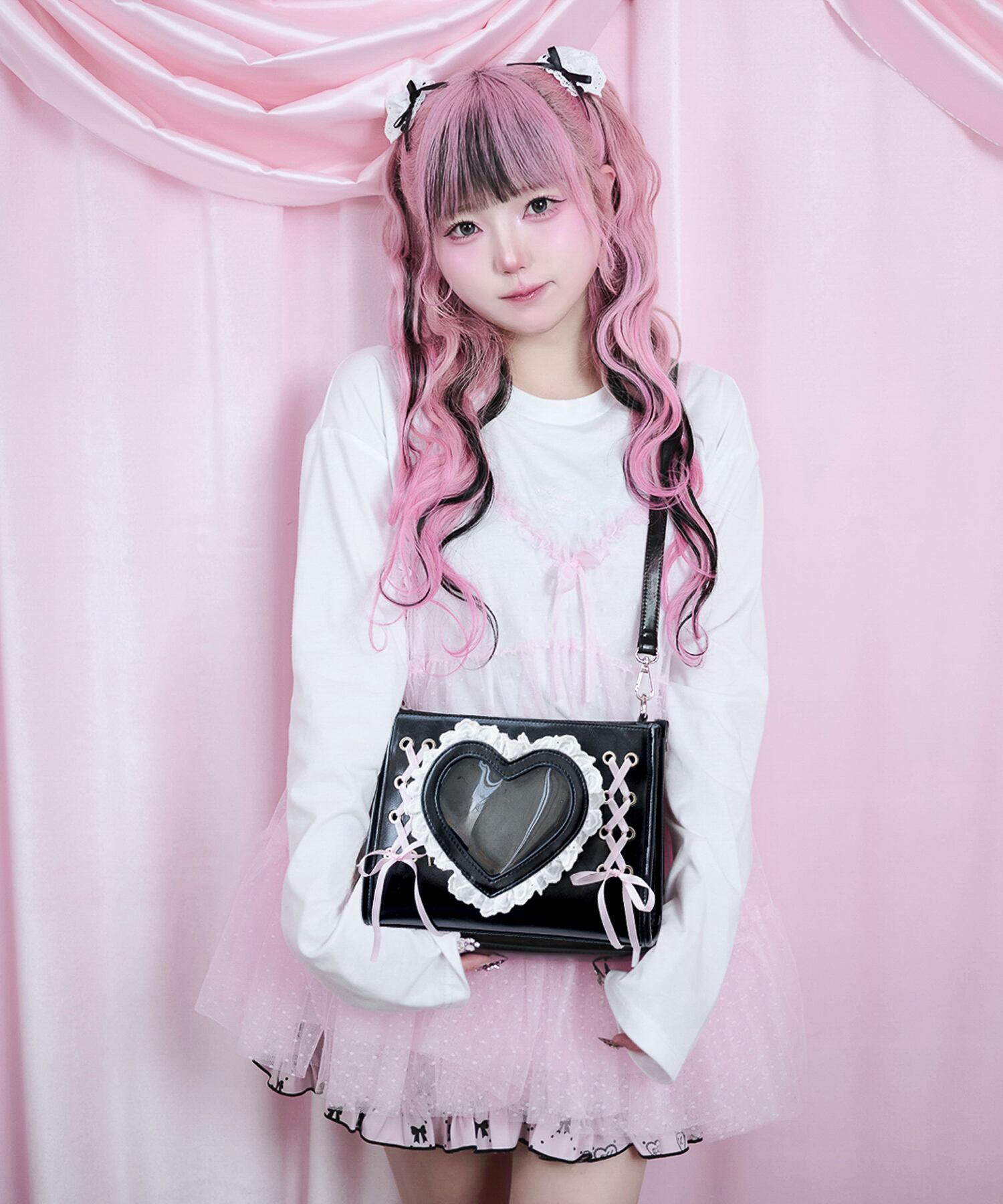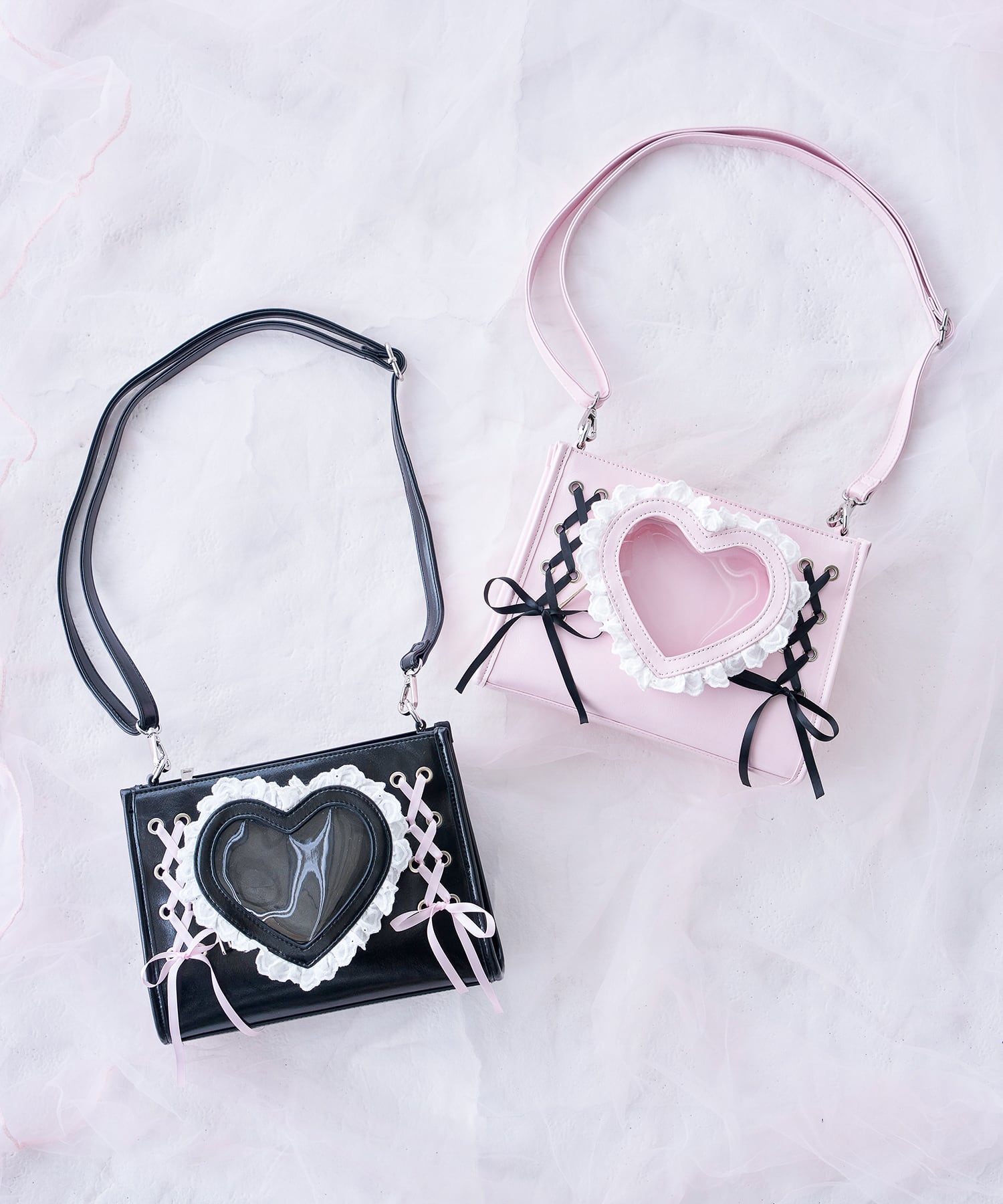中央の大きなハート型クリア窓に、お気に入りのぬいぐるみや小物を入れて、特別なバッグにカスタマイズ♡