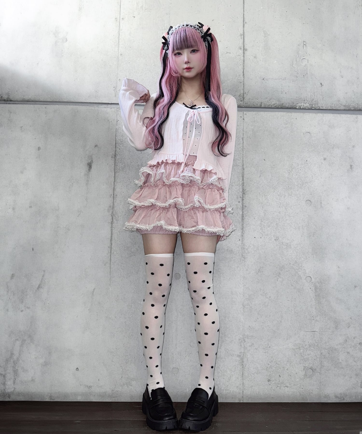 キャミソールはドット柄に、胸元のはしごレース×リボンがポイント♡
